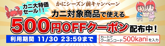 今なら 「全カニ商品対象」に500円OFFクーポン配布中!クーポンと値下げダブルで超お買得です。商品によっては10,000円も値下げになっているものもありますので、この機会をお見逃しなく!